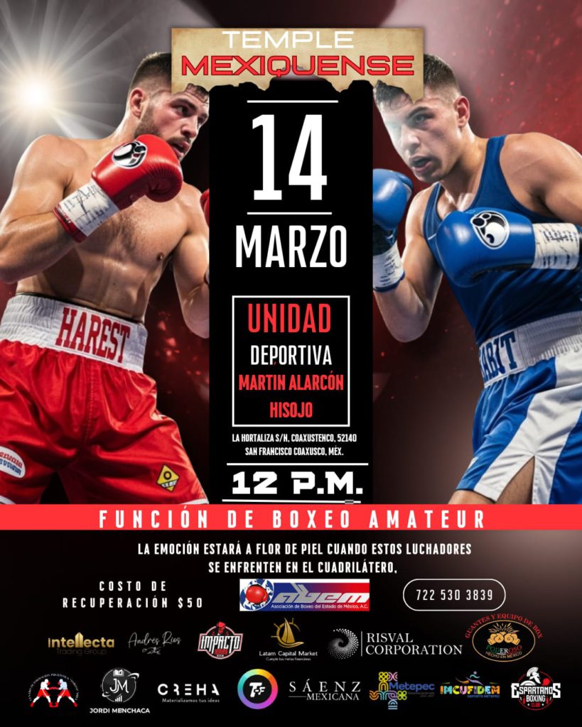 El boxeo amateur tendrá un nuevo espacio para impulsar a los jóvenes talentos del Estado de México con la función “Temple Mexiquense”, que se realizará el próximo sábado 14 de marzo de 2026 a las 12:00 horas en la Unidad Deportiva “Martín Alarcón Hisojo”, en el municipio de Metepec.